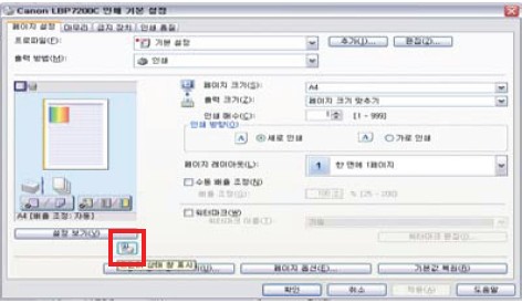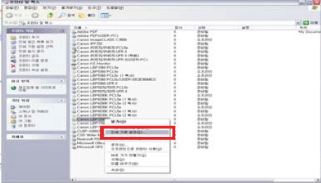 1) 프린터 및 팩스 폴더에서 해당기종에 인쇄기본설정을 클릭합니다.